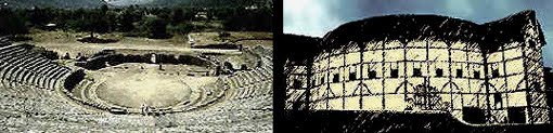 In honour of Dionysus an ancient Greek chorus sang hymns in front of the temple and as dialogue developed between the chorus and a masked soloist, and dance became action we may have seen the genesis of drama. The stories or poems recited or sung by Homer (the Iliad and the Odyssey) and the like were the Greek foundation of dramatic story telling. Soon these combined and moved to specially built amphitheatres. Greek theatre flourished as did similar tale telling later in Rome. Probably even earlier in Egypt the solemn chants and processions in honour of the gods inspired the Greeks and other foreign civilisations. No doubt prior to that the earliest religious ceremonies grew around the central divine fire and as stories of the hunt and the gods and their interactions with mankind became more sophisticated so did the need to transmit that understanding to the illiterate populous. Orators and public representations told tales of the gods and the heroes to inspire, instruct, unify and control. Tales of the famous, satires of the ruling elite and bawdy titillation also grew in popular acceptance. How theatrical is the image of priests in special costumes, gods or their representatives draped in jewels and ribbons, processions, props, fire and incense and the accompaniment of music and chants praising the acts of the divine. The Satyr Play (above left) was one of the earliest examples of drama (or tragedy). The followers of Dionysus dressed as satyrs and sang songs of his exploits. The actor in the costume of the Satyr, which is half goat, was called the ‘tragos’ (goat in Greek), and the song is called the ‘tragodia’ (goat song).